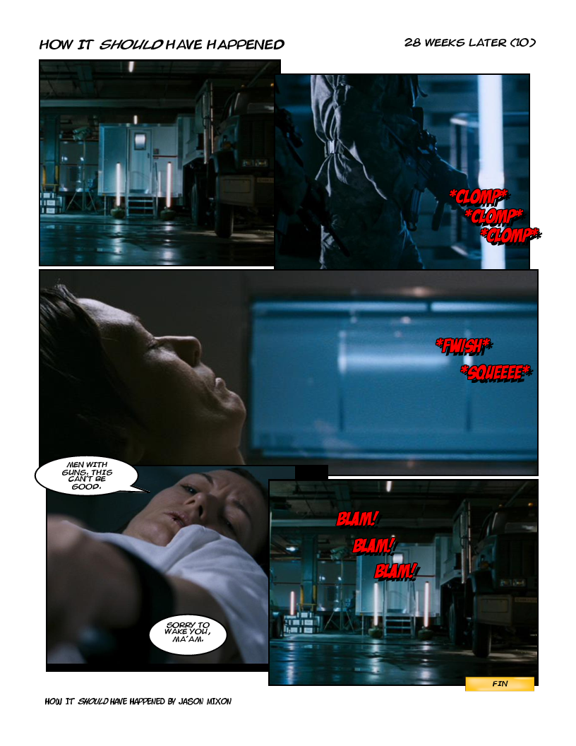 Ah, the final scene. This is what the first nine pages was bringing to a close. This is my vision of what should have happened. Sure, it makes for a very short movie, but it makes more sense than having a civilian refugee with free access to the entire base getting infected and starting everything over again. Not only that, but when he did get infected, he seemed to retain some sort of intelligence which goes against everything that was established about the virus in the first movie and the beginning of the second. I don’t mind fantastic tales, in fact some of my favorite movies are all about fantasy. But making characters and established organizations break their own rules and defy logic is a deal breaker for me. As good as the first movie was, this movie started out great, then burst the bubble at this point. From here on it’s a never ending stream of BS. If there is a third (the end left it open for one), I certainly hope they go back to the original premise, right the train on its tracks and get back to making a movie that is worth watching.